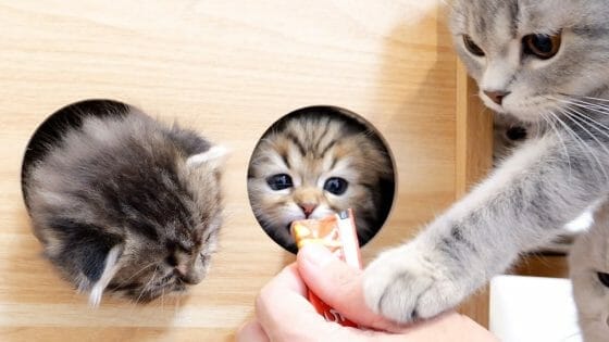 mixed emotion while eating together with 4 cats in one plate. Momsie